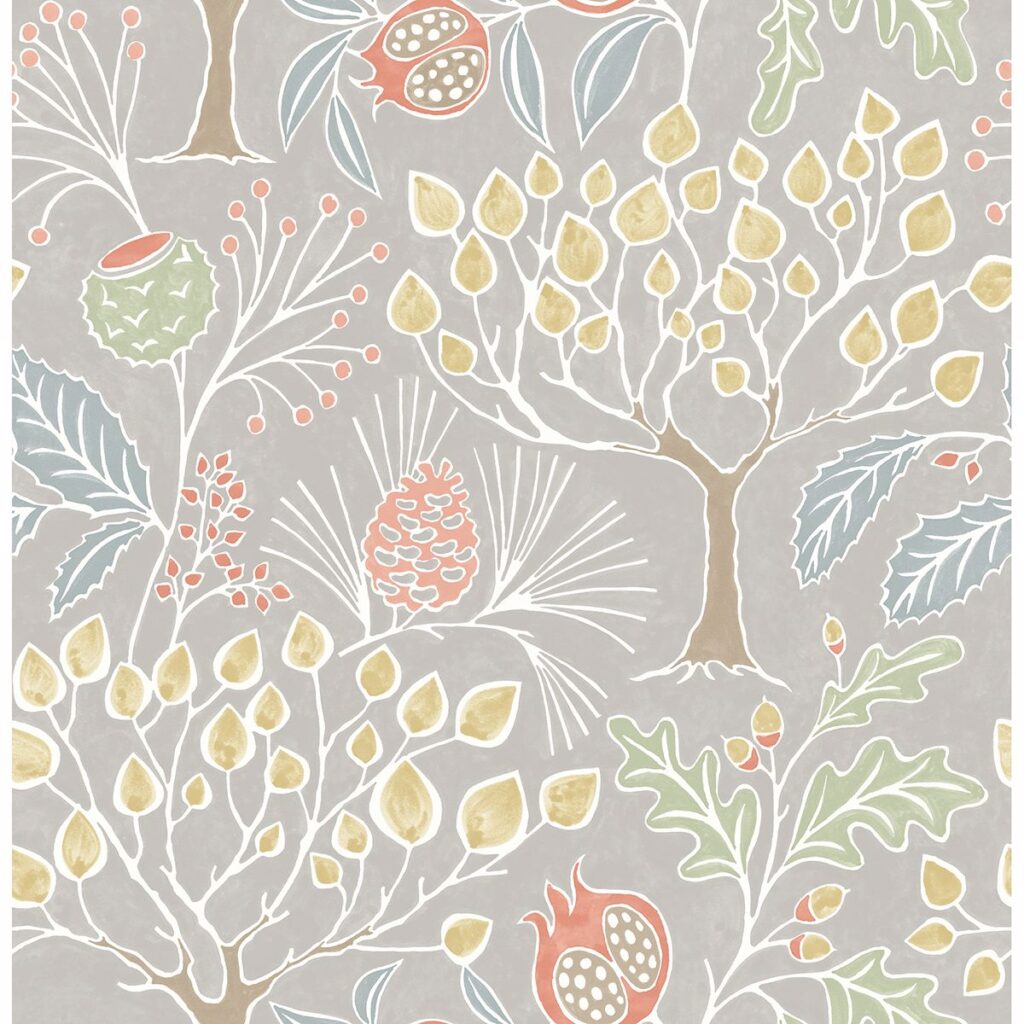 Orange pomegranates, coral pine cones and light brown trees make up this charming woodland print. Hand painted details lend to its vintage inspired style. Shiloh is an unpasted, non woven wallpaper.