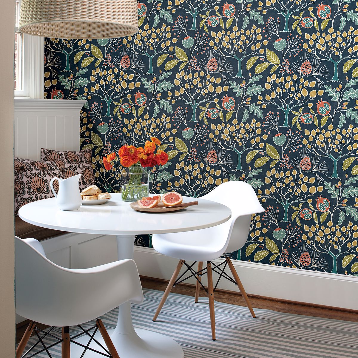 Get lost in this multicolored woodland scene. This painterly pattern features an array of vintage-style flora, including pine, pomegranates and oak trees over a navy background. Shiloh is an unpasted, non woven wallpaper.