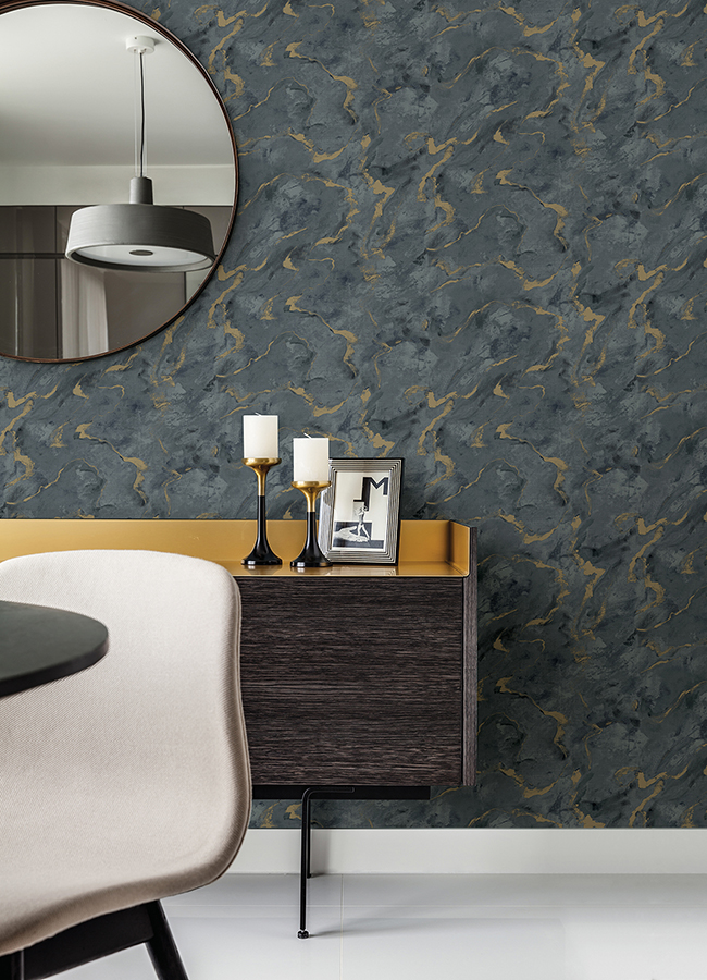 Soothing blue hues meets ethereal elegance in this timeless marbled design. Swirls of blue, from pale blue-grey to rich denim hues, are embellished with liquid tendrils of metallic gold. Silenus is an unpasted, non woven wallpaper.