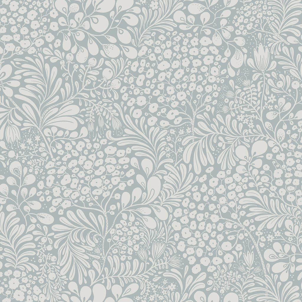 Add a splash of earthen tranquility to your walls with this gorgeous botanical design. Flowers, berries and leafy branches twine together, all inked in white against a powder blue background. Siv is an unpasted, non woven wallpaper.