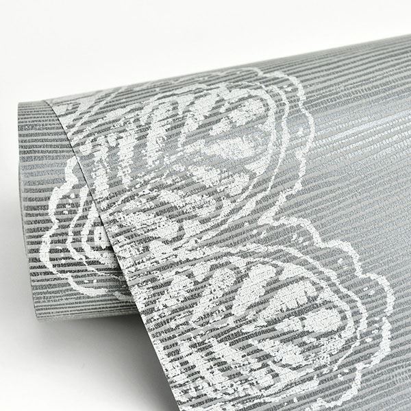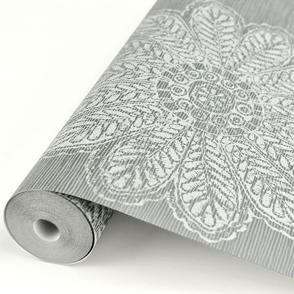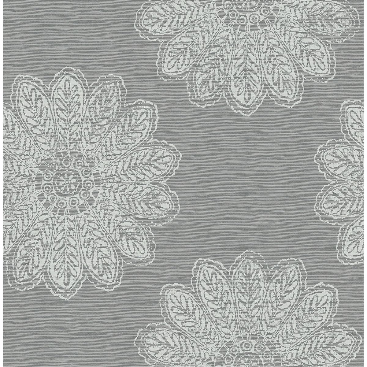 Large-scale floral medallions are rendered in a bohemian, tribal style. The slate grey background flashes metallic silver beneath a raised horizontal texture. Sol is an unpasted, non woven wallpaper.