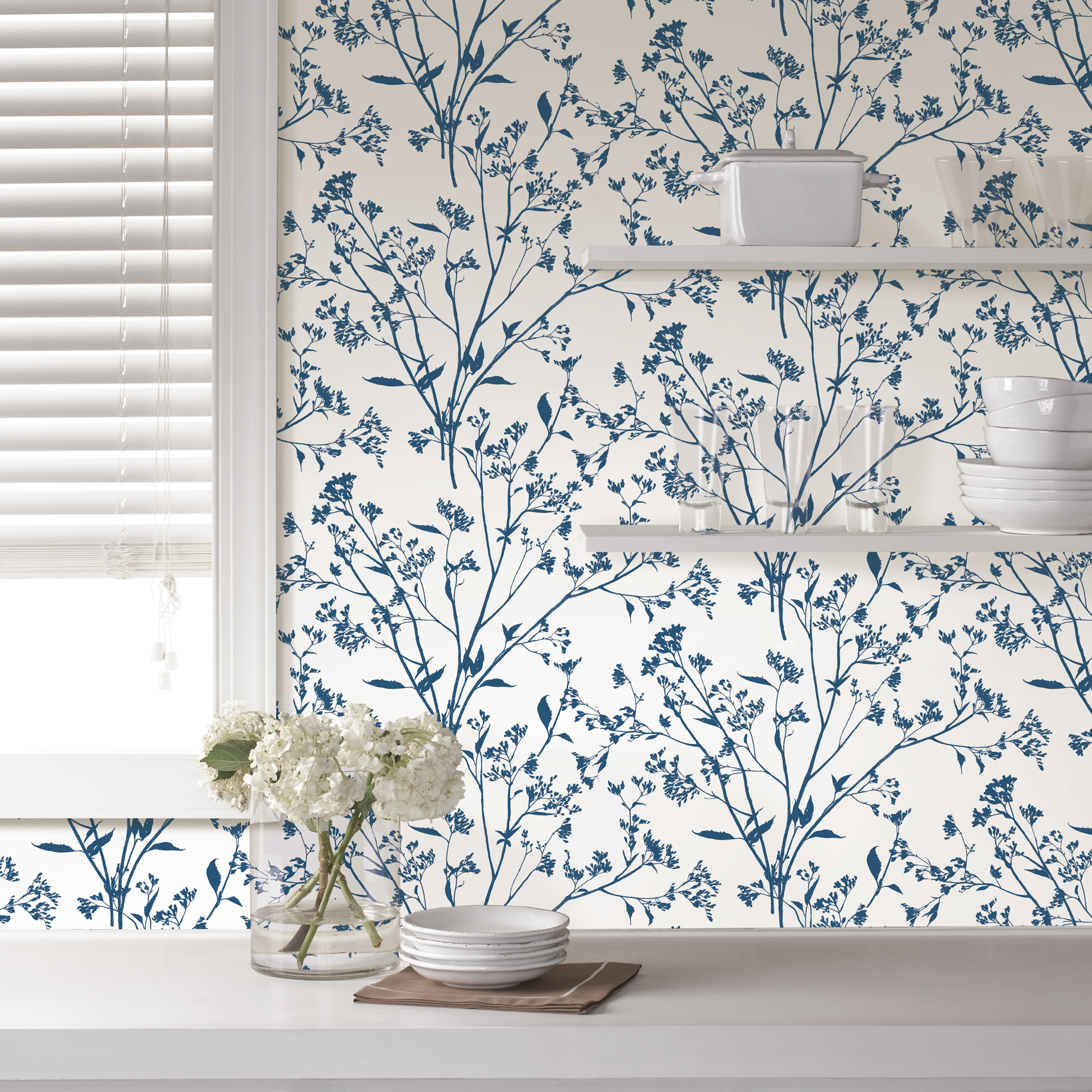 This simple and sophisticated botanical wallpaper will elevate the look of your home. The soft white background is covered by delicate blue branches with small, spindly leaves. Southport is an unpasted, screen acrylic coated wallpaper.