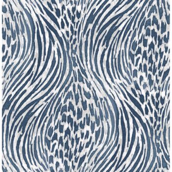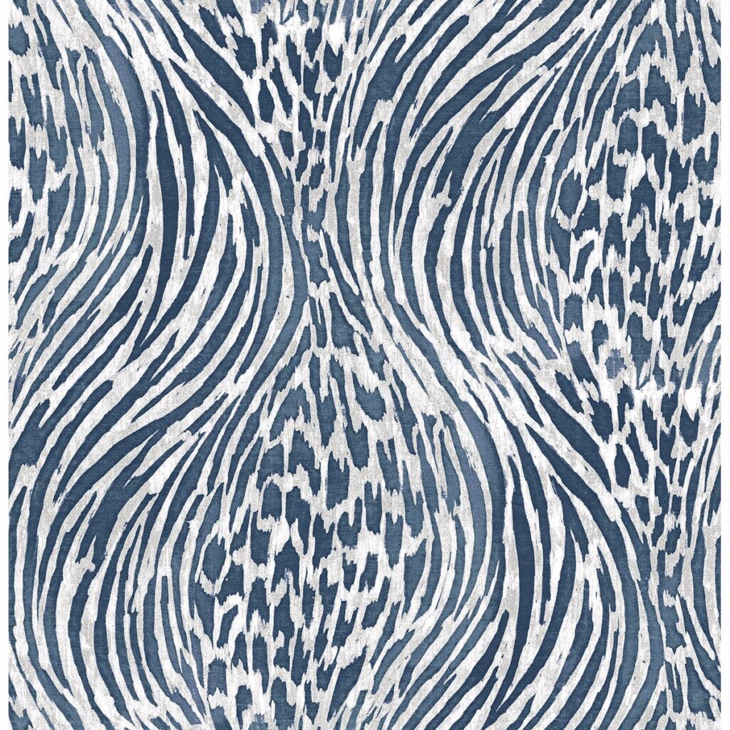 Zebra and leopard print melt together into a mesmerizing ogee pattern. The navy pattern has flashes of metallic blue ink and grey accents. Splendid is a non woven, unpasted wallpaper.