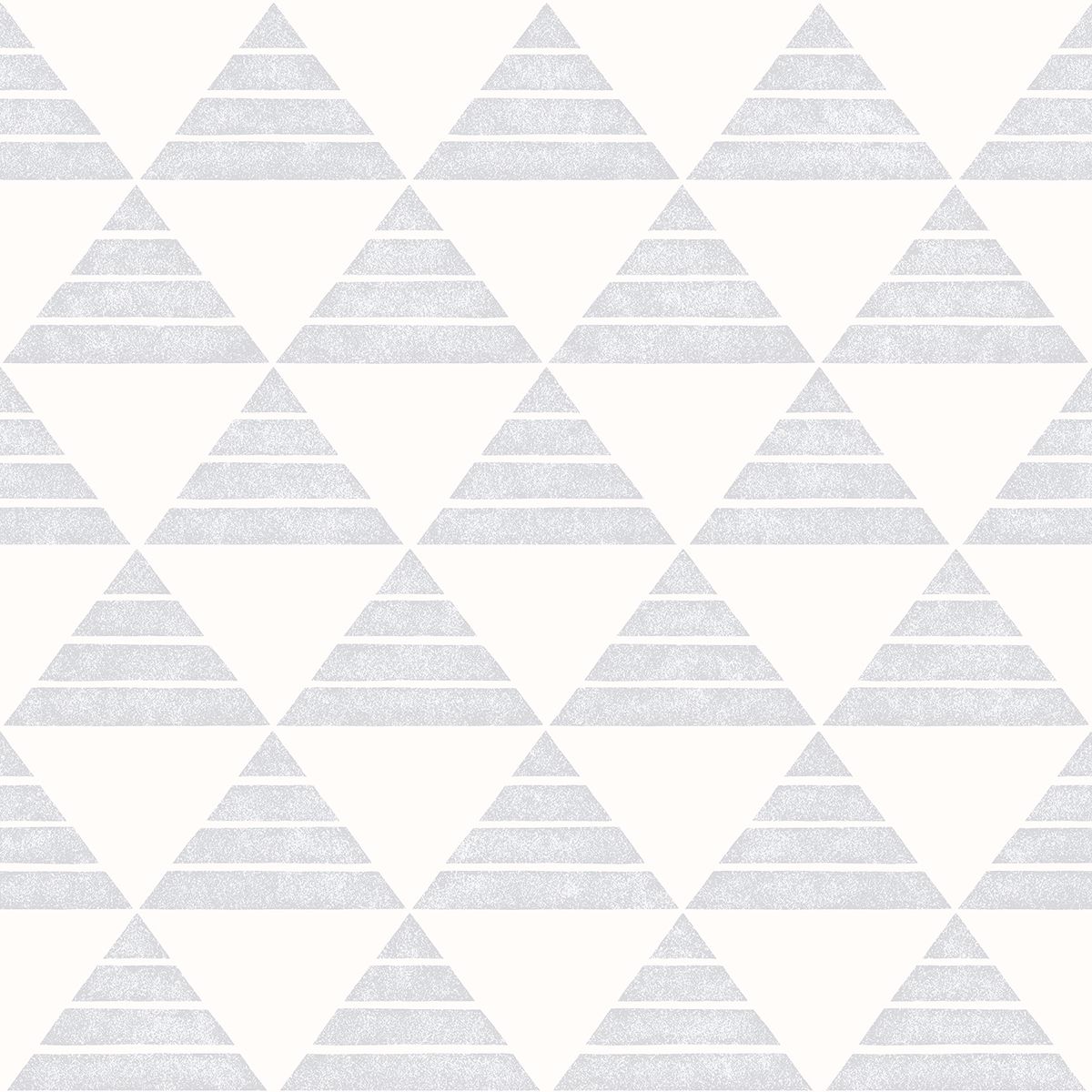 This modern wallpaper has a bright white background and light grey triangles that create a chic design. A distressed effect adds texture to the print.