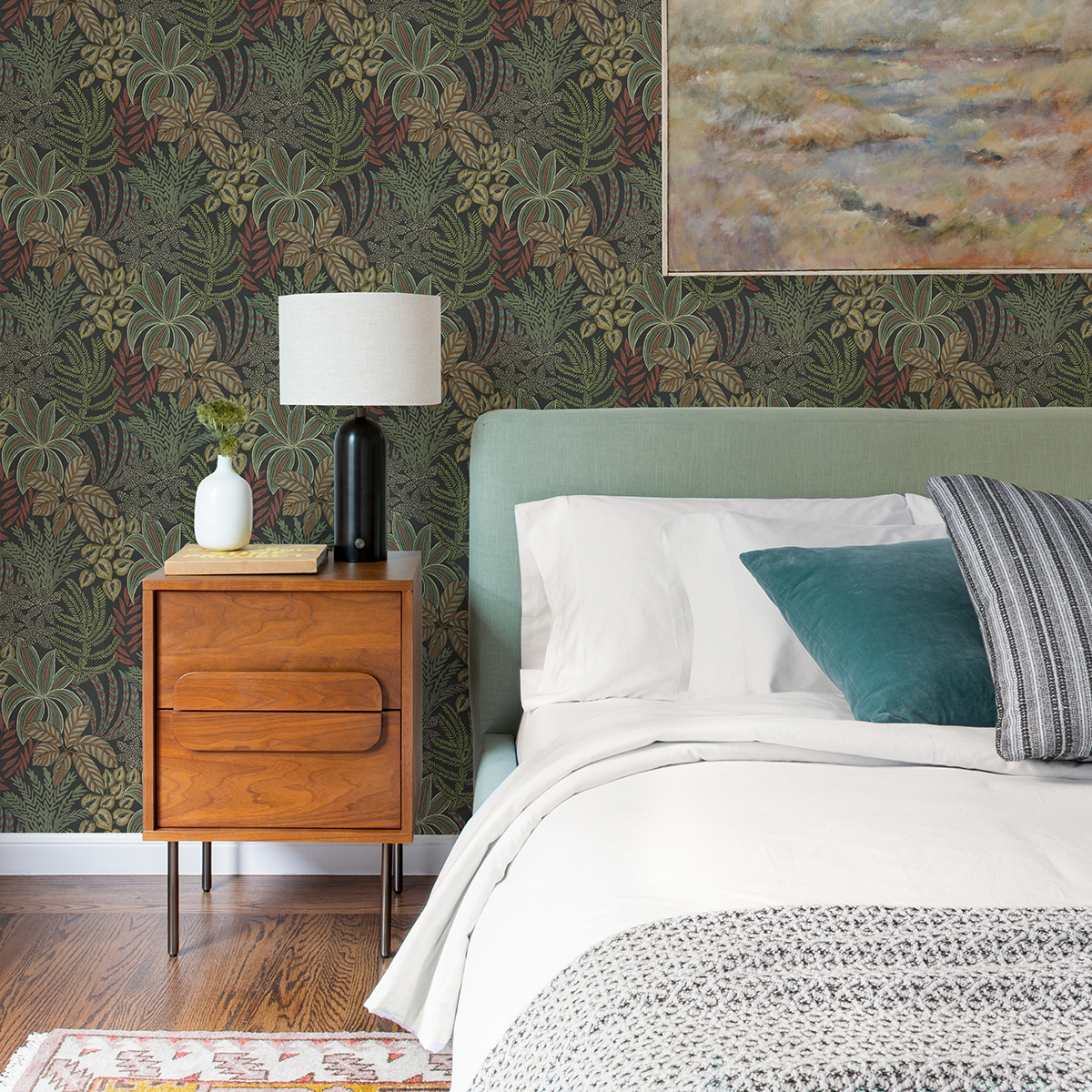 Rejuvenate your space with this rich botanical design. Ferns and other woodland plants are artistically illustrated in an array of greens, reds, blues, yellows and browns against a matte black backdrop. Sumner is an unpasted, non woven wallpaper.