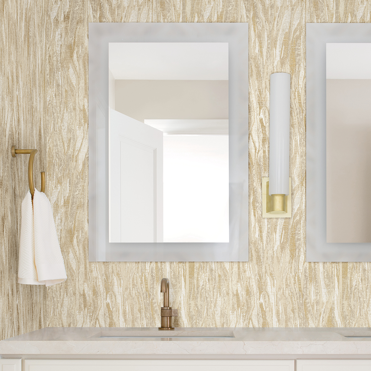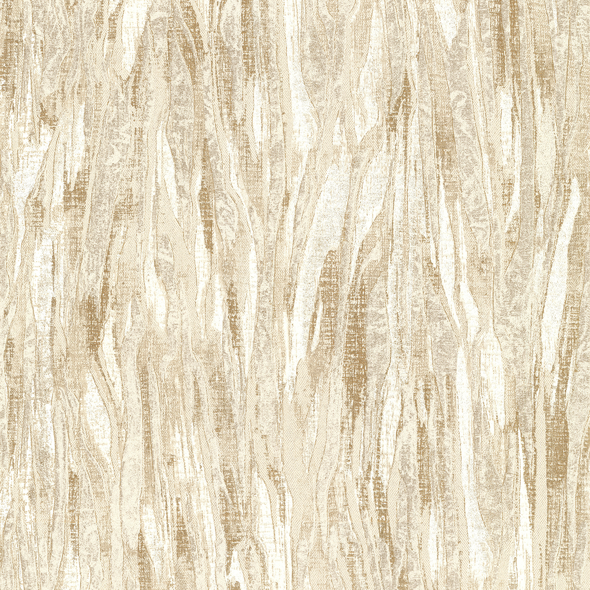 Add elegant natural textures to your home with this wallpaper. The warm taupe backdrop is lined with wavering stripes of cream dusted with glittering gold that mimic the look of wide sections of woodgrain. Suna is an unpasted, foil on non woven wallpaper.
