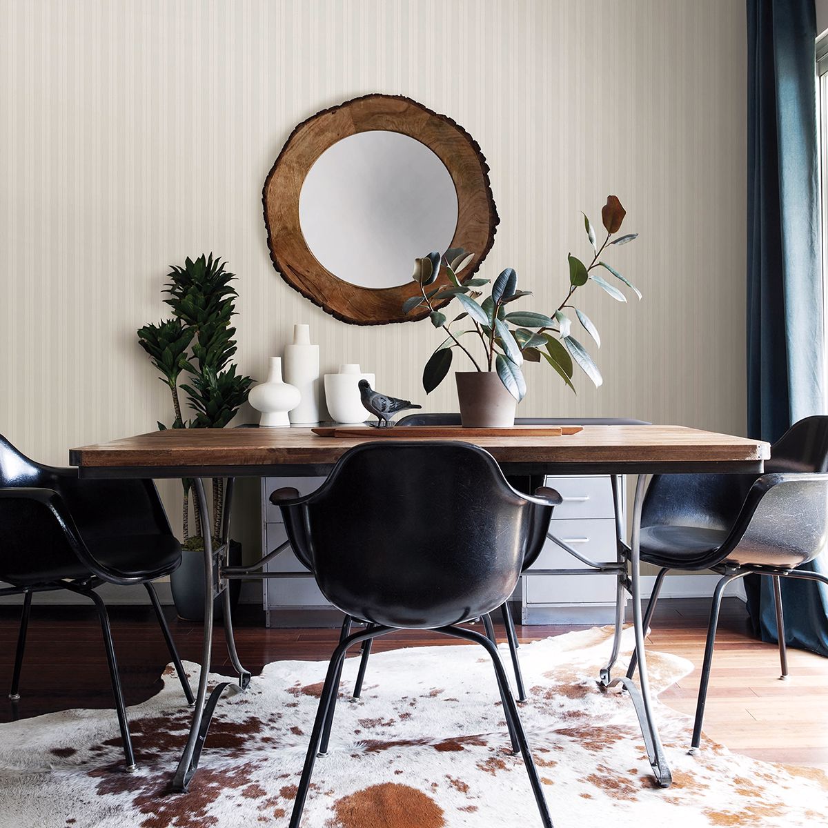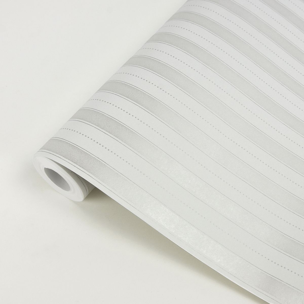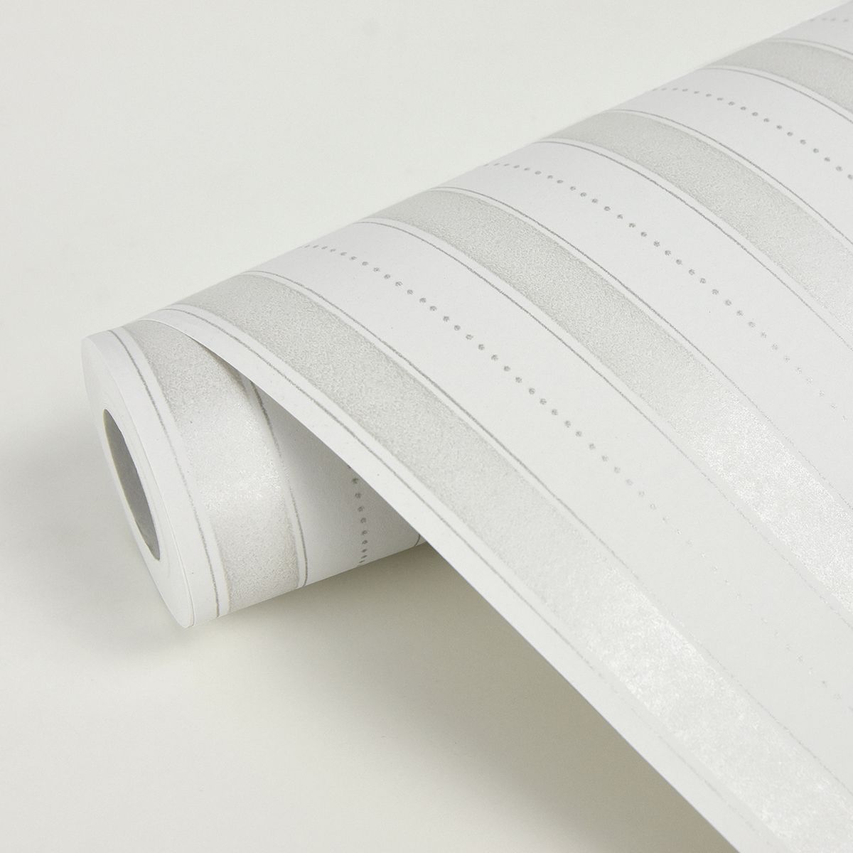 A traditional wallpaper with a Scandinavian flair, this design features alternating solid and dotted stripes. Its palette of white and silver hues will brighten any space. Symphony is an unpasted, non woven wallpaper.
