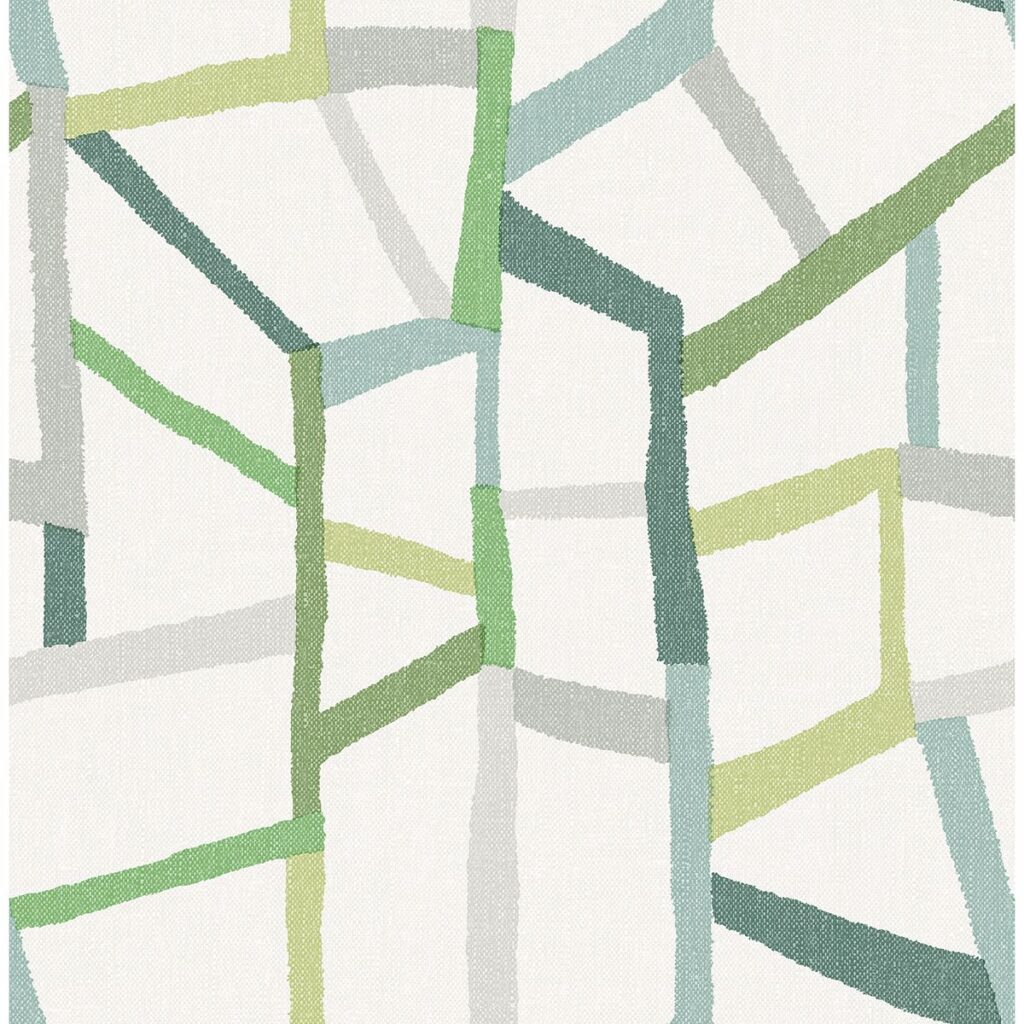 Bright green, teal and grey geometrics pop against an off-white background in this linen inspired design. Its woven pattern is complete with raised inks for a dimensional effect. Tate is an unpasted, non woven wallpaper.