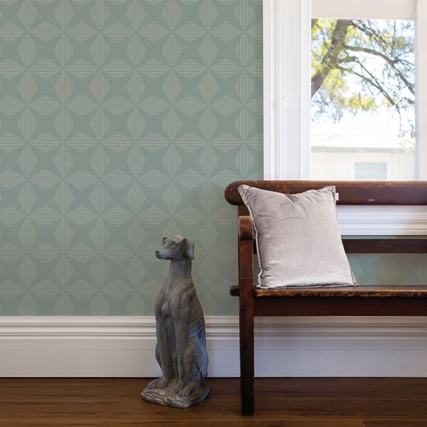 A serene teal blue backdrop hosts a white geometric design. Its array of lines create stunning diamond and star shapes throughout its unique pattern. Telestar is an unpasted, non woven wallpaper.