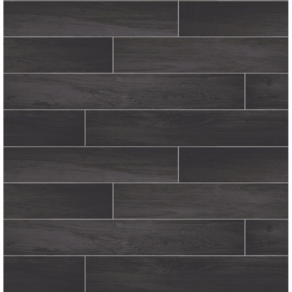 This industrial wood wallpaper creates a bold look in charcoal grey. The dark color helps to ground larger spaces and add drama in smaller rooms. A matching grey caulking nods to a classic subway tile design. Planks measure 2.5 inches wide.