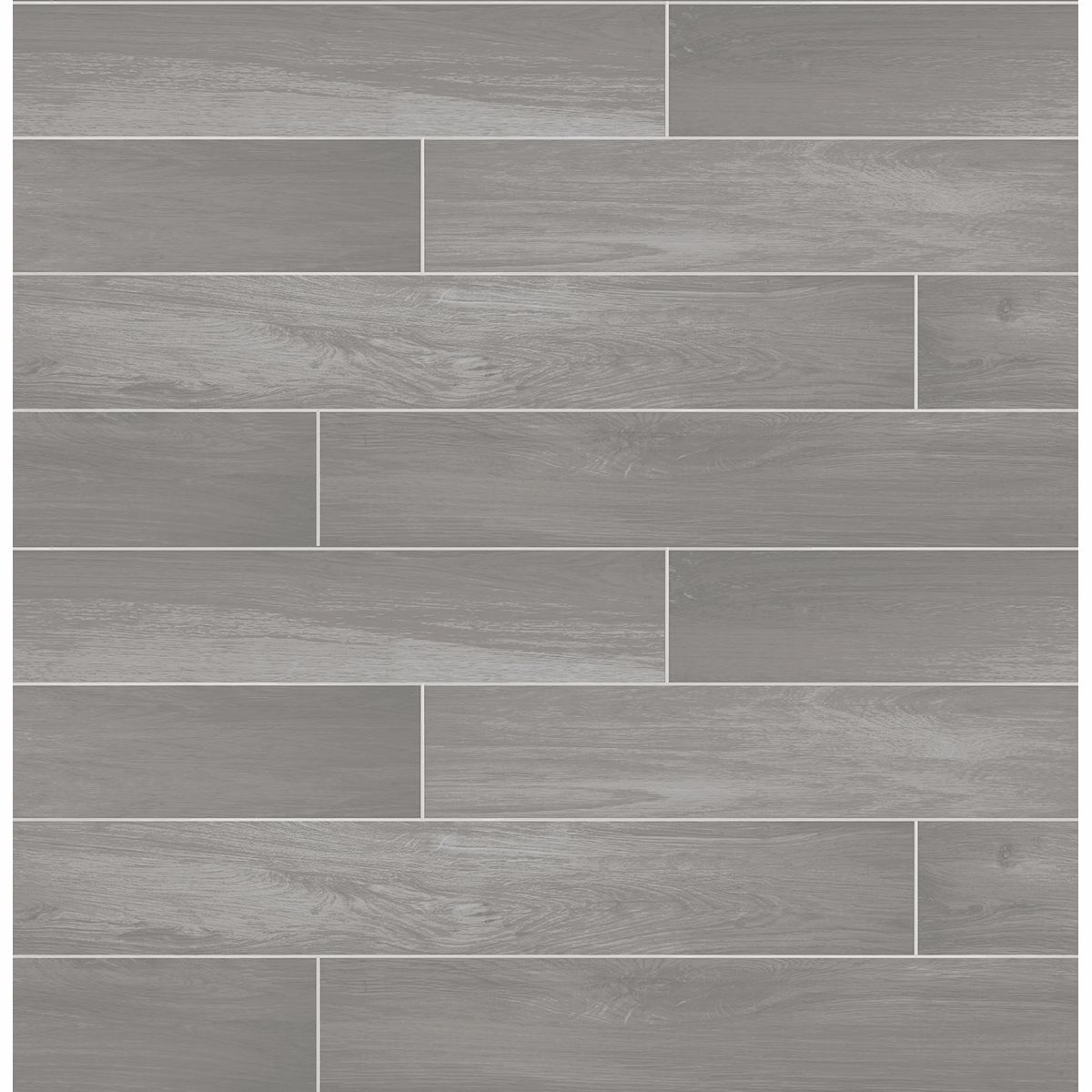This modern grey wood wallpaper has a sleek, clean look with a thin faux caulking line in a nod to classic subway tile. The design would work well in a kitchen, bathroom, or as a feature wall in a larger room. Planks measure 2.5 inches wide.