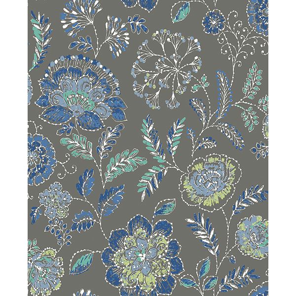 Give your walls an entirely new look with this large scale floral wallpaper. The design has shades of blue and green atop a charcoal background. White raised inks add dimension.