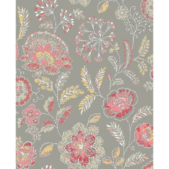 This large scale Jacobean floral is the perfect combination of modern and classic. The grey background is on trend while the coral and mustard flowers bring color and movement. White raised inks add detail and dimension.