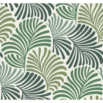 This tropical wallpaper enjoys modern movement. The fanning fronds twine side by side and are painted in a variety of saturated greens against white. Trousdale is an unpasted, non woven wallpaper measuring 27 inches wide by 27 feet long, covering approxiamately About 60.8 square feet square feet per roll
