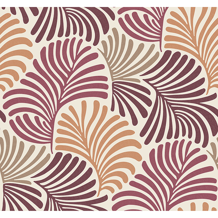 Bring movement and tropical flair to your interiors with this botanical wallpaper. Palm fronds fan and curve around one another, the movement accentuated by the vibrant color palette of raspberry, tangerine, burgundy, light brown, and pale taupe. Trousdale is an unpasted, non woven wallpaper measuring 27 inches wide by 27 feet long, covering approxiamately About 60.8 square feet square feet per roll