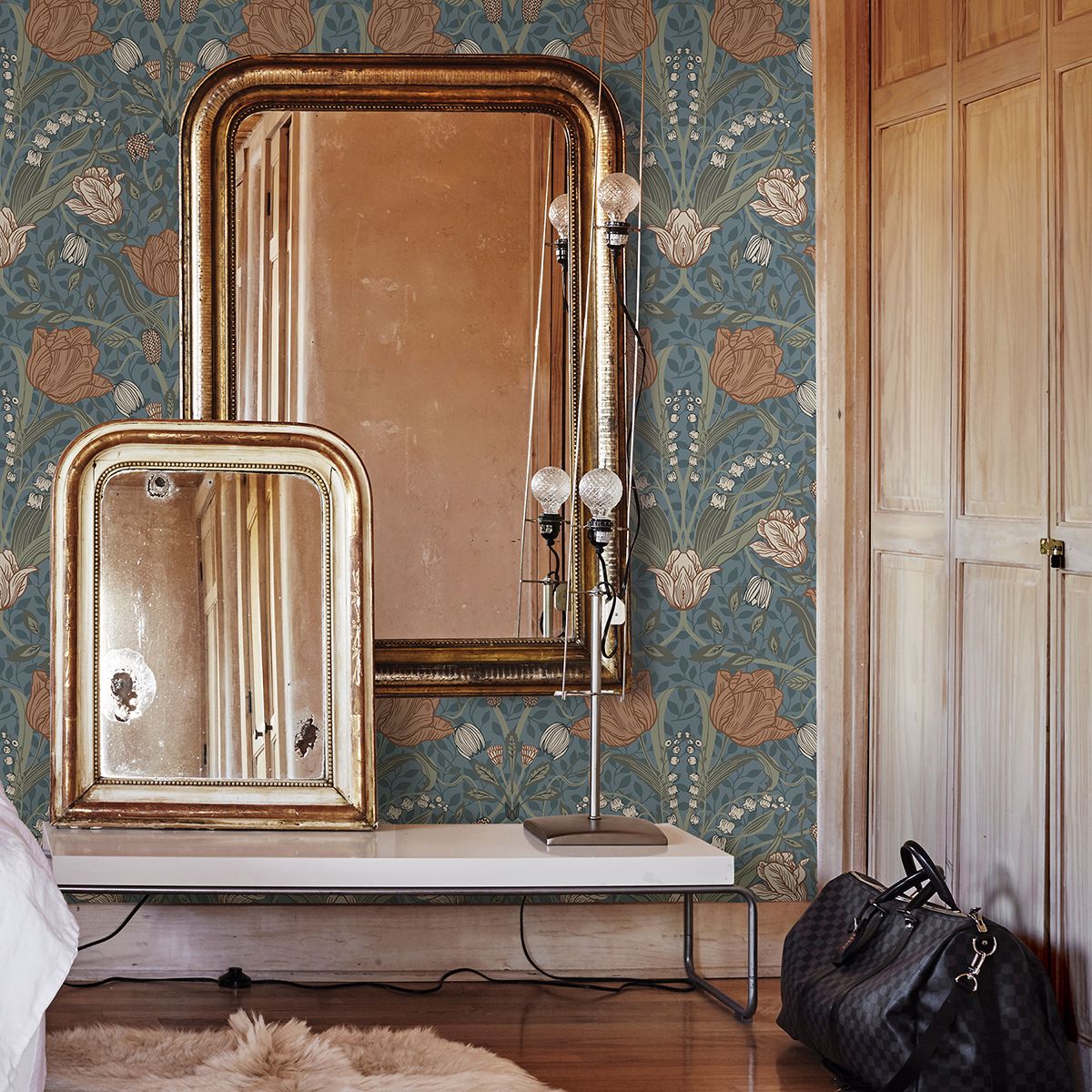 Light red and off-white tulips mingle with stunning foxgloves against a rich blue backdrop in this nature inspired design. Its painterly design will add both a whimsical and vintage flair to rooms. Tulipa is an unpasted, non woven wallpaper.