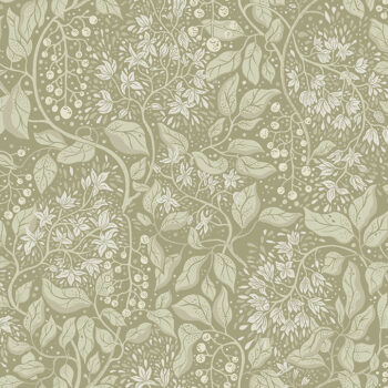 This illustrative botanical wallpaper celebrates the first overtures of spring. Twining, leafy vines are bedecked in spindly flowers and tiny berries, the verdant palette of light greens and white adding to its fresh, springtime feel. Turi is an unpasted, non woven wallpaper measuring 20.9 inches wide by 33 feet long, covering approxiamately About 57.5 square feet square feet per roll