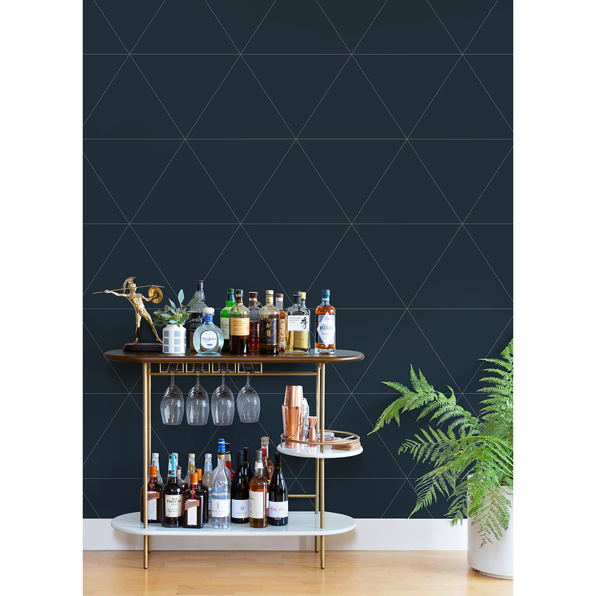 Enjoy the simple elegance of minimal detailing with this modern geometric wallpaper. Inky black is embellished with thin lines of silver to create a grid of large triangles. Twilight is an unpasted, acrylic coated wallpaper.