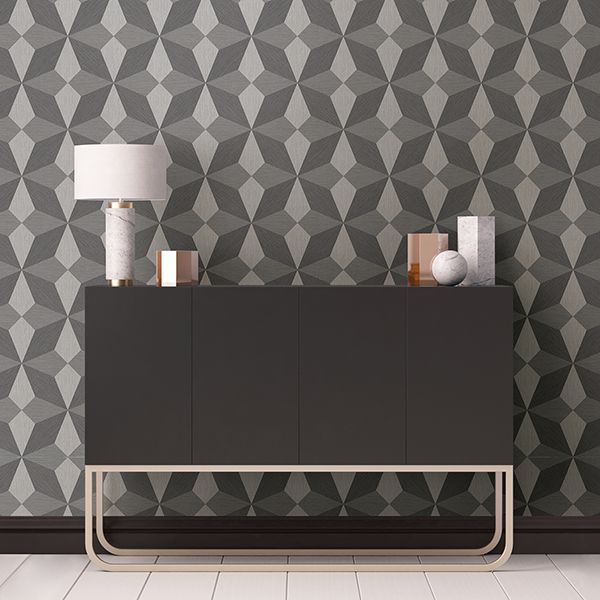 Complete with an intriguing geometric pattern and various shades of grey, this faux grasscloth wallpaper has a contemporary edge. Raised inks and a tightly woven design lend to its realistic look. Valiant is an unpasted, non woven wallpaper.