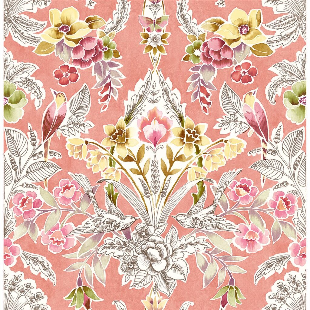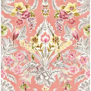 Add a splash of color to walls with this unbelievable vintage inspired wallpaper. Gorgeous botanical damasks comprised of pink birds, yellow flowers and green leaves pop against a vibrant coral background. Vera is an unpasted, non woven wallpaper.
