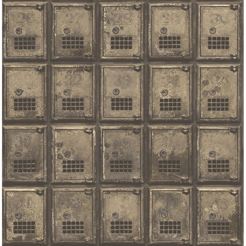 Add a unique look to your home decor with this P.O. box wallpaper. This design has a photorealistic appearance with metallic accents, distressed textures, high contrast shading, and turn locks.