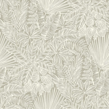 Tranquil and lush, this elegant botanical wallpaper will enliven your interiors. An array of tropical foliage is intricately detailed in creamy white against a brown faux linen backdrop. Vita is an unpasted, non woven wallpaper.