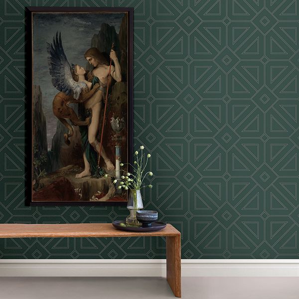 Dazzling and luxurious, this wallpaper features a stunning geometric print comprised of silver beads. A rich green background adds a moody flair to its sophisticated energy. Voltaire is an unpasted, non woven wallpaper.