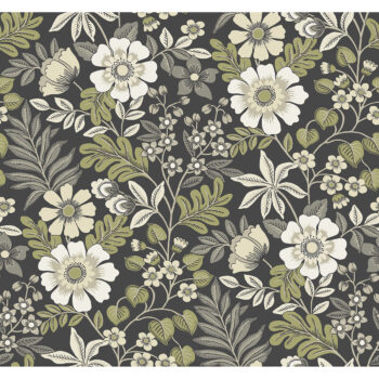 This charming, retro-inspired floral wallpaper will bring rich contrast to your space. White daisies and grey and green leaves pop against a black backdrop, the design’s illustrative styling adding to its charms. Voysey is an unpasted, non woven wallpaper.
