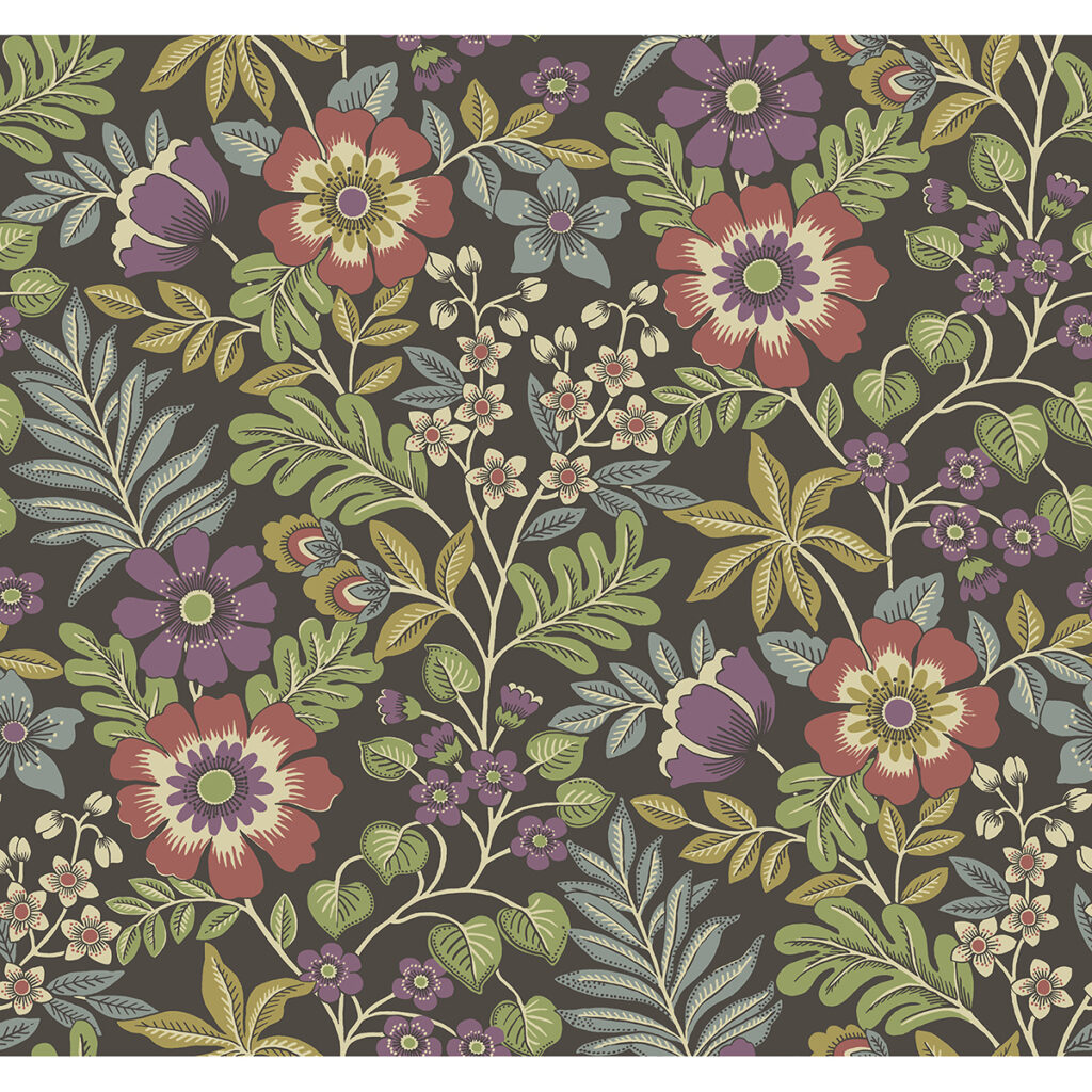 Bring a little charm to your space with this boisterous floral wallpaper. Inspired by the loving ornamentation of the Arts and Crafts movement, this illustrative design features a medley of flowers and leaves in faded rainbow dues against dark brown. Voysey is an unpasted, non woven wallpaper.