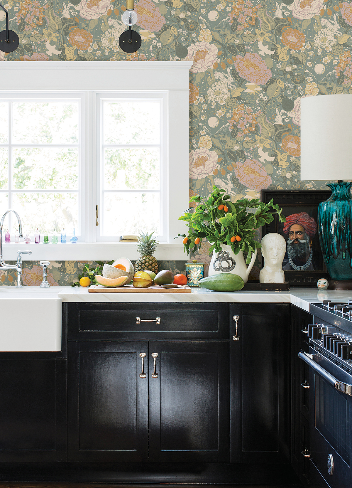 A medley of summertime memories are hidden within this gorgeous botanical design! Tucked between the voluptuous rosehips are swings, sailing trips, mountain hikes, bunnies, and birds, all inked in warm pink, orange, yellow, sage, and dark green against a blue-grey backdrop. V√§xa is an unpasted, non woven wallpaper.