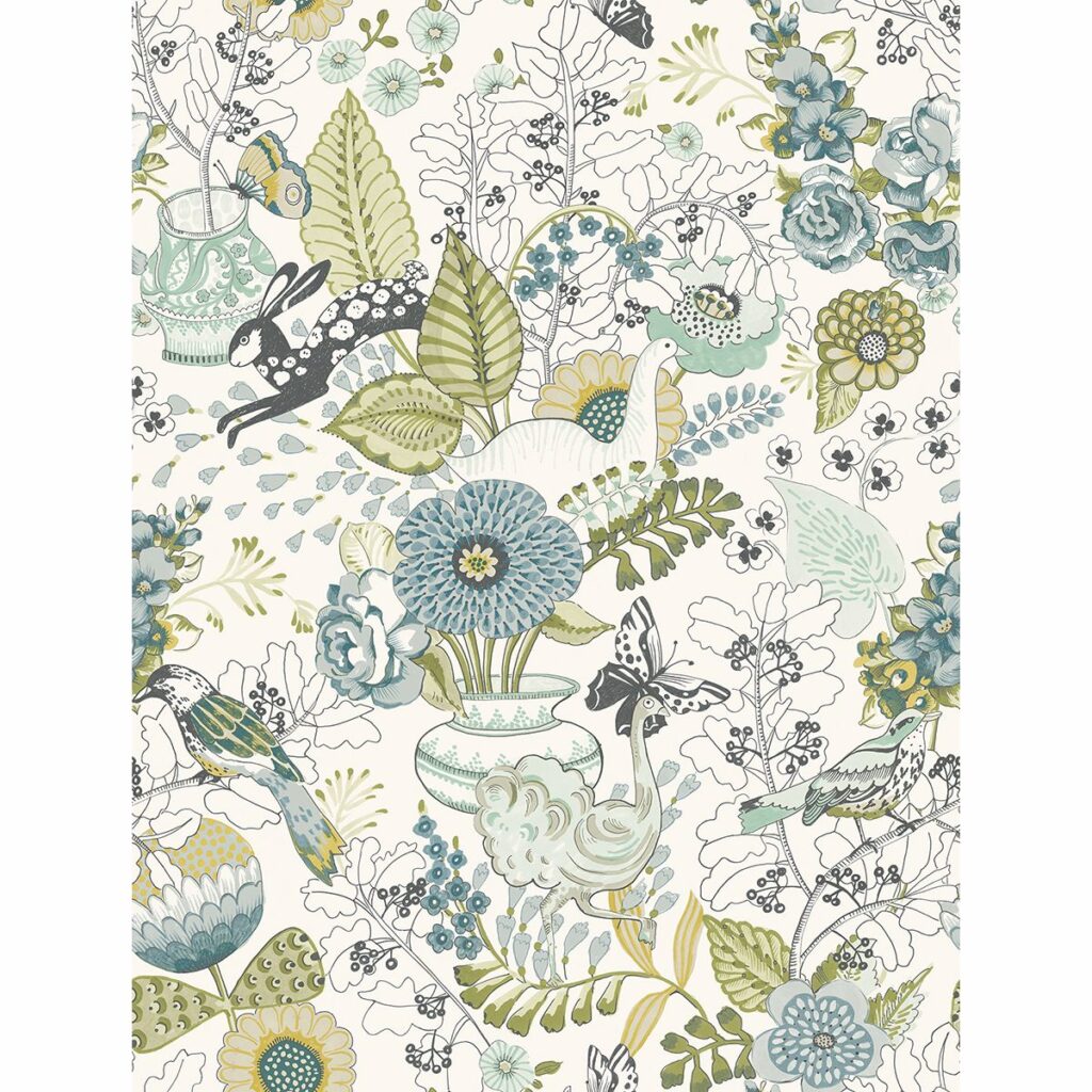 With dreamy blue, teal and green hues, this lively floral and fauna print has an upbeat energy. Gorgeous potted flowers blossom amongst daring rabbits and whimsical birds in this eclectic print. Whimsy is an unpasted, non woven wallpaper.