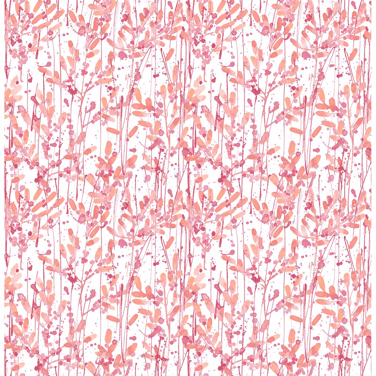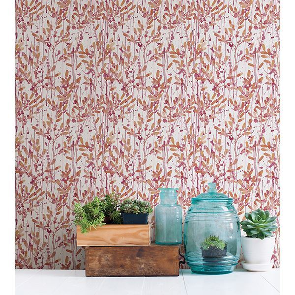 Pretty shades of peach and pink bring life to this unique wallpaper. The leaf print brings in an element of nature while the watercolor splatter effect mimics an artist’s paintbrush.