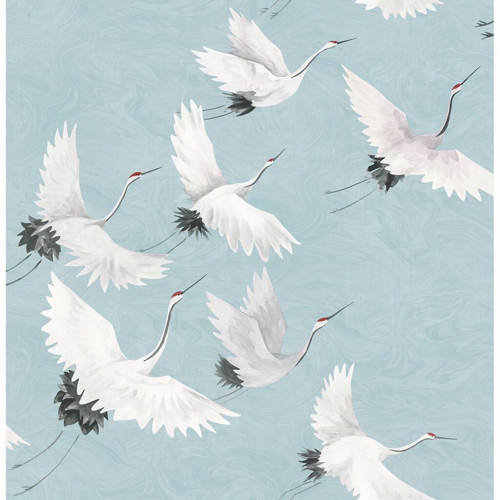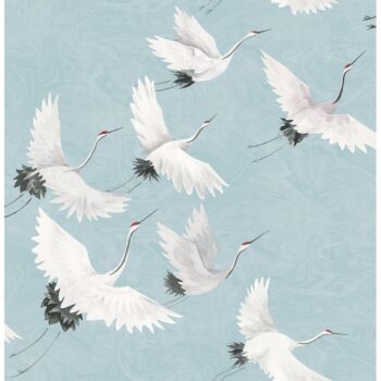 A shade of blue leaning toward turquoise creates a stunning sky for cranes to fly through. The flowing brushstrokes of the hand-painted bird pattern are echoed in the marbled swirls of the background. Windsong is a unpasted, non woven wallpaper.