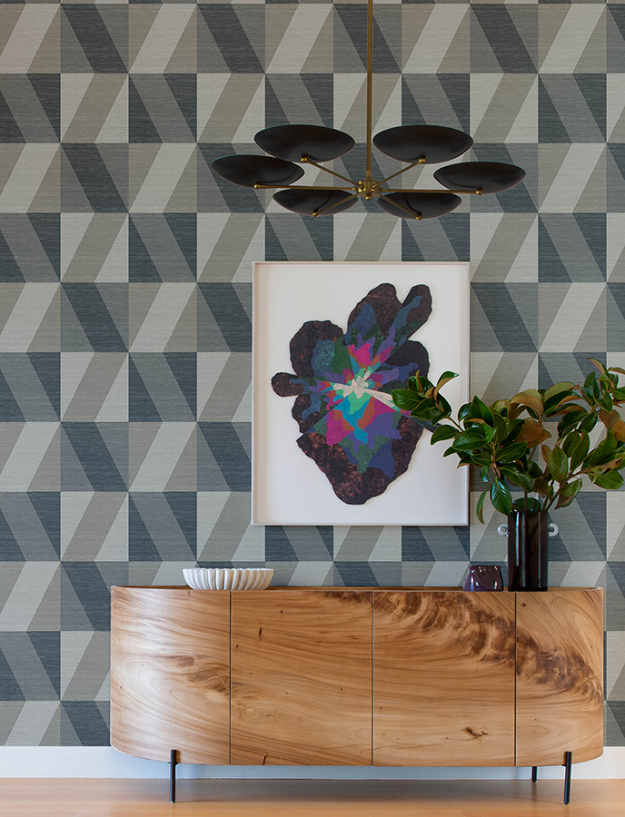 Masculine and timeless, this large-scale geometric wallpaper features angular forms in a range of rich blue and grey hues, all further elevated with a faux grasscloth texture and soft silver pearlescence. Winslow is an unpasted, non woven wallpaper measuring 20.5 inches wide by 33 feet long, covering approximately 56.4 square feet per roll.