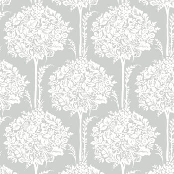It doesn’t get more timeless than this stately topiary design. A pair of birds perch within the flowering branches of these manicured trees, the details inked in white against cool grey. Zaria is an unpasted, non woven wallpaper.
