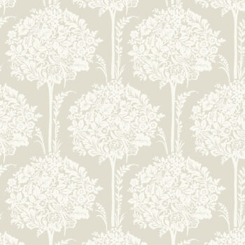 Enjoy timeless sophistication and the subtly of neutral hues with this gorgeous tree wallpaper. Lovingly tended topiaries are laced with flowers and visited by birds, the design stamped in white against a delicate taupe backdrop. Zaria is an unpasted, non woven wallpaper.