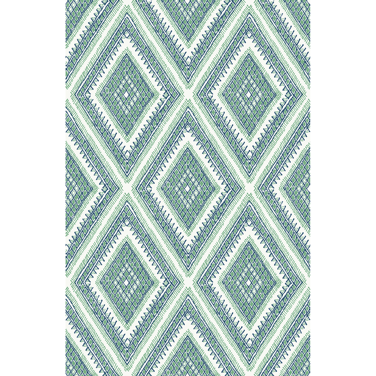 Add bohemian flair to your home with this bright, tribal-inspired geometric wallpaper. Large diamonds are formed from a series of smaller diamonds, triangles and lines in both blue and green. Texture from an overlay of subtle raised inks adds additional dimension to the design. Zaya is an unpasted, non woven wallpaper.