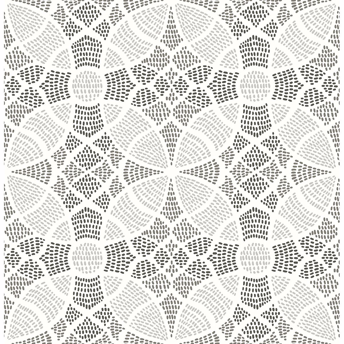 An abstract floral pattern is created by overlapping shapes filled with dark taupe, black, and grey dots. The grey sections are printed with raised ink for a textural feel. Zazen is a unpasted, non woven wallpaper.