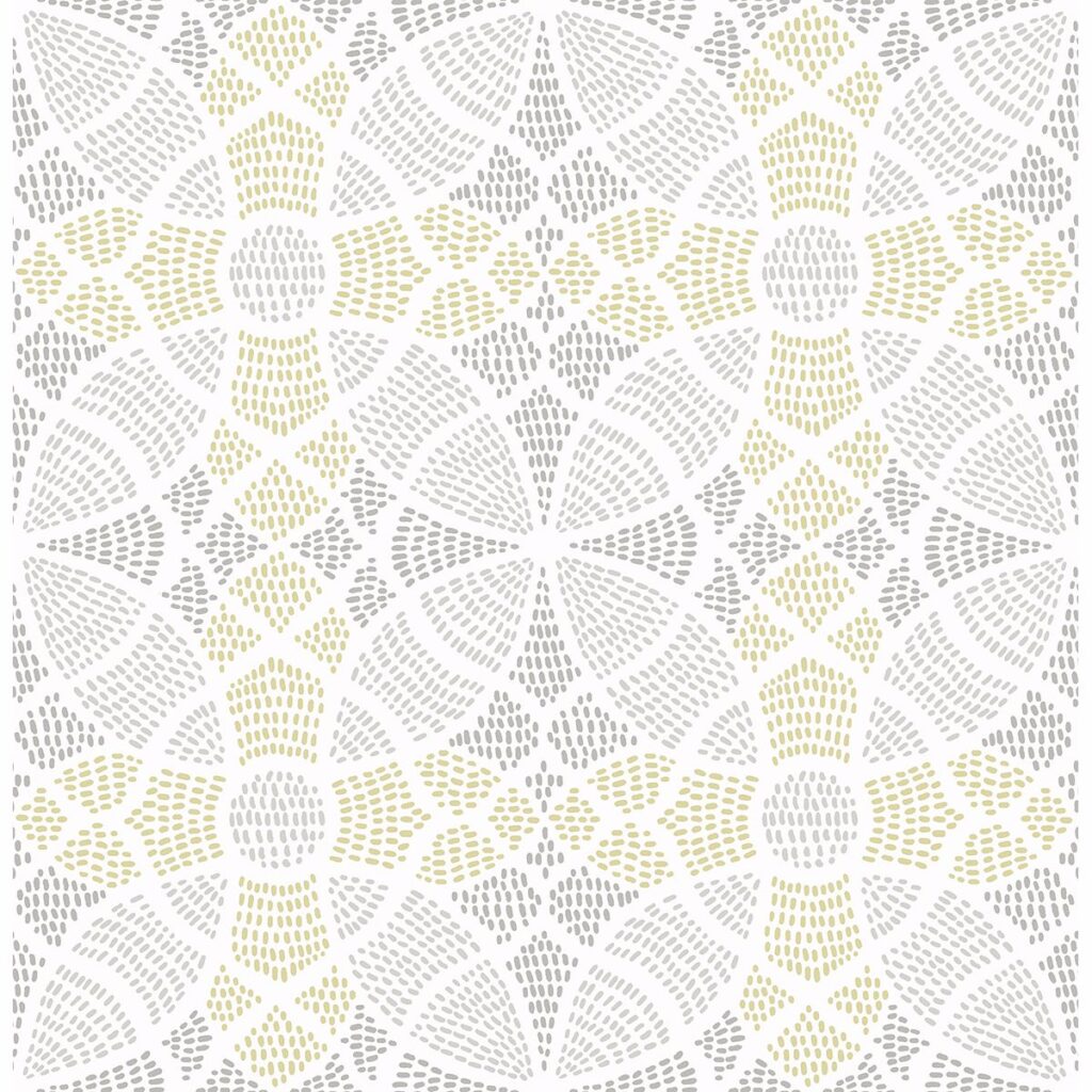 Dotted sections create the look of interlocking circles in this wallpaper. A darker grey is set apart from the goldenrod and light grey with a raised ink texture. Zazen is a unpasted, non woven wallpaper.