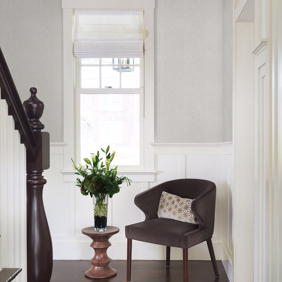 Add dimension to walls with this abstract geometric wallpaper. Hundreds of white speckles pop with raised inks against a lovely grey background. Zenith is an unpasted, non woven wallpaper.