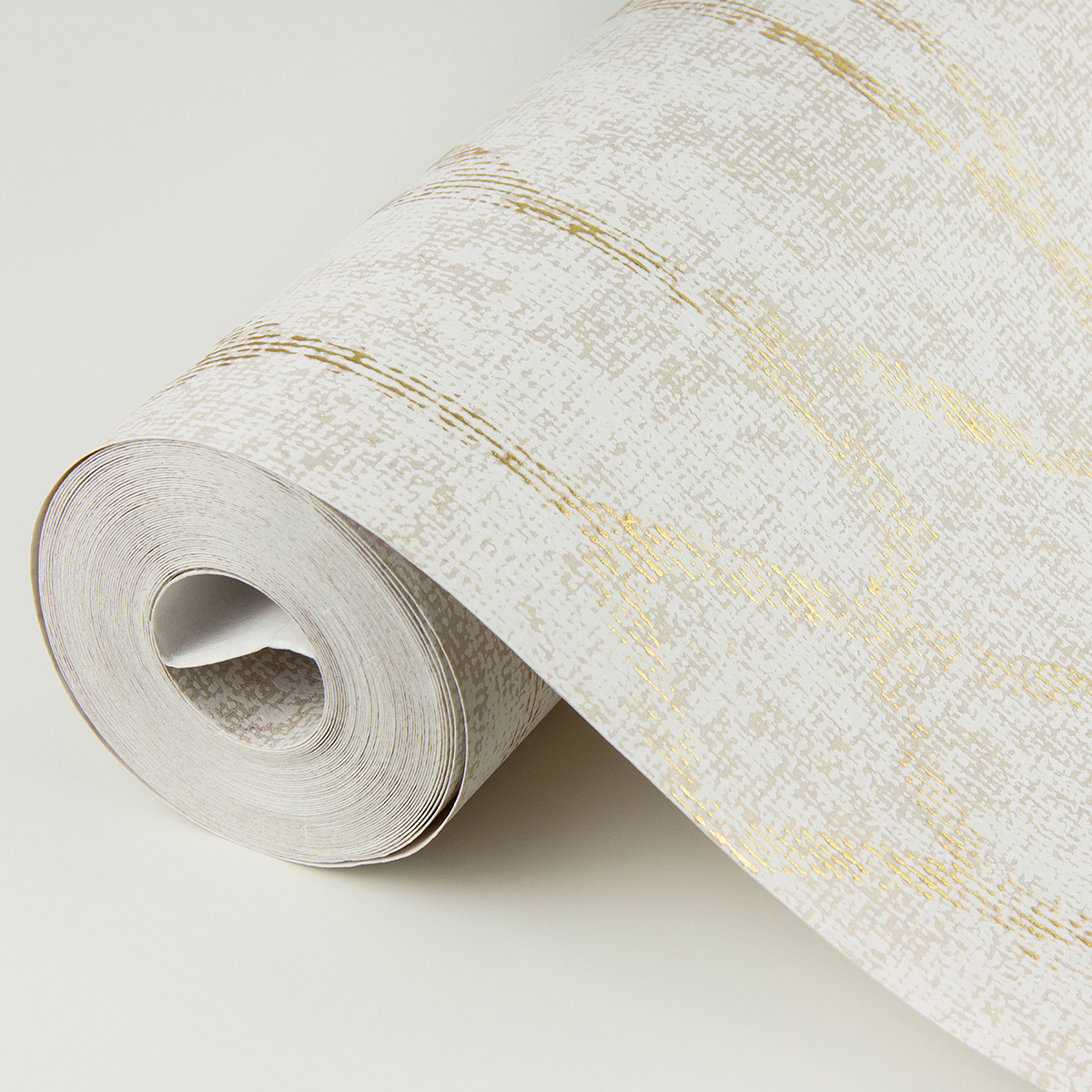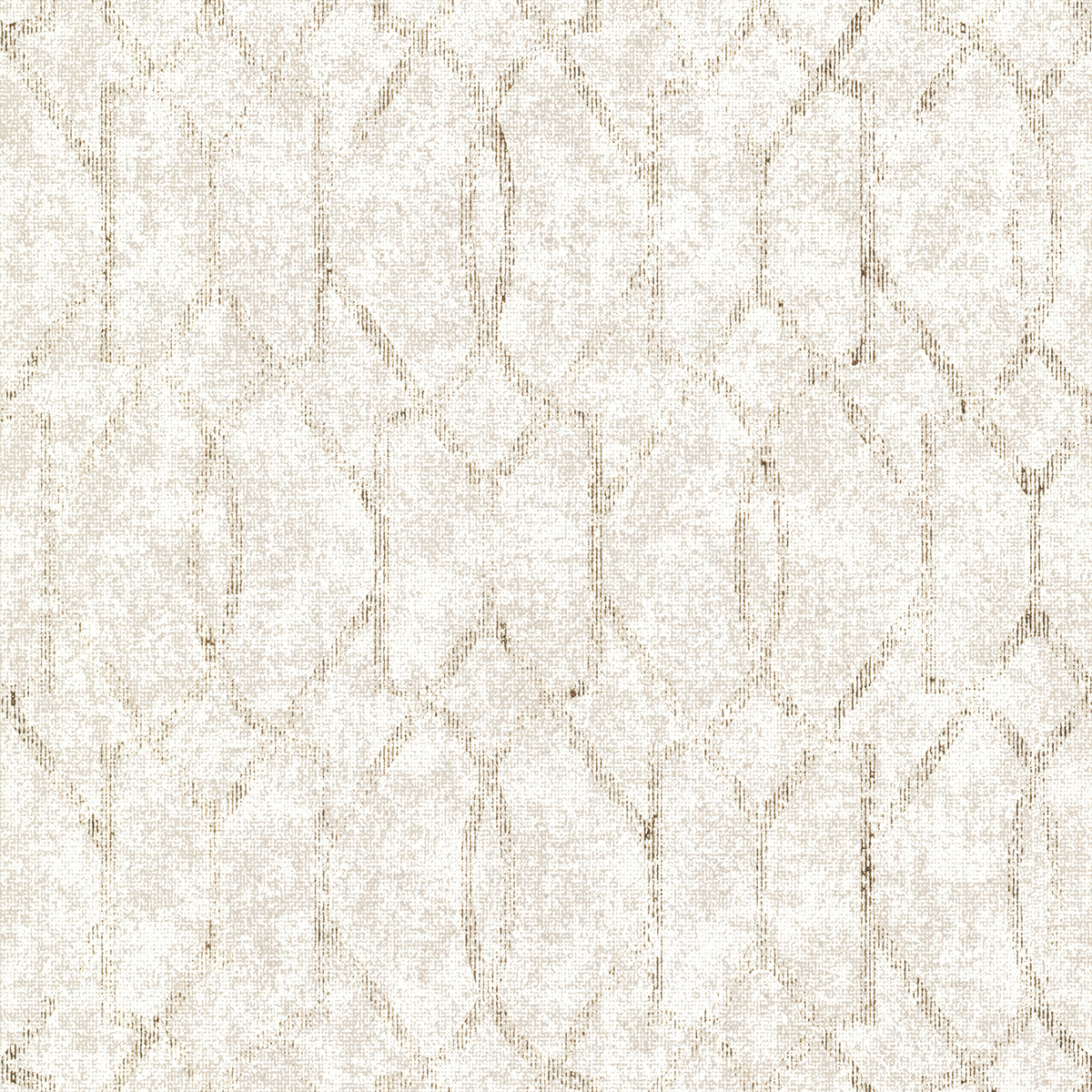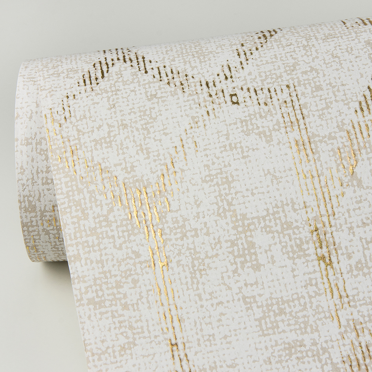 The classic trellis is given a contemporary upgrade with this wallpaper. A blend of cream and khaki is overlaid with a curved and angular lattice composed of glittering dashes of gold raised ink. Ziva is an unpasted, foil on non woven wallpaper.