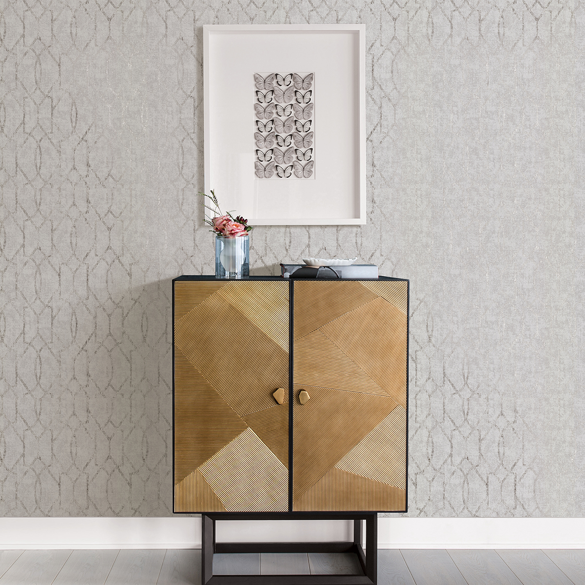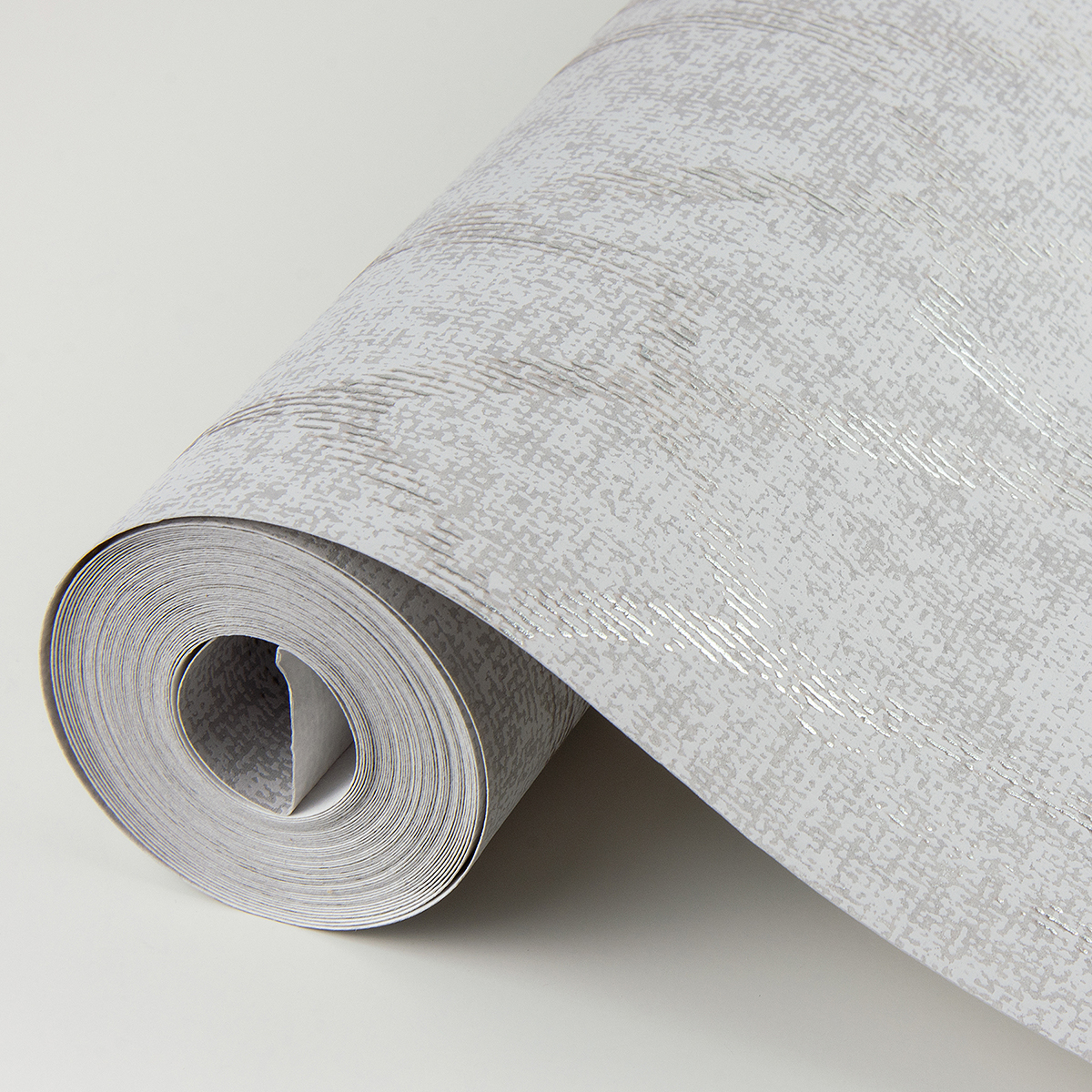 The classic elegance of trellis design is given a modern update in this wallpaper. The variegated light grey background is overlaid with a curved and angular lattice composed of shining silver raised ink. Ziva is an unpasted, foil on non woven wallpaper.
